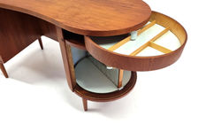 Rare, iconic, fully restored model 54, kidney-shaped double-sided desk offering a circular storage section with a large tambour /